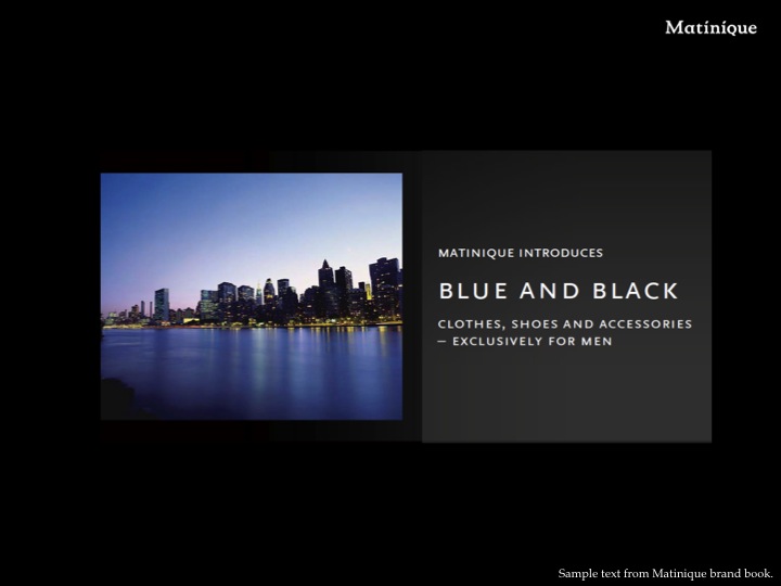 The project: Matinique was dividing into two parts: the casual Blue Label and the more formal Black Label. The brand needed a new communications platform to express the values behind each label and create a foundation for all materials going forward.